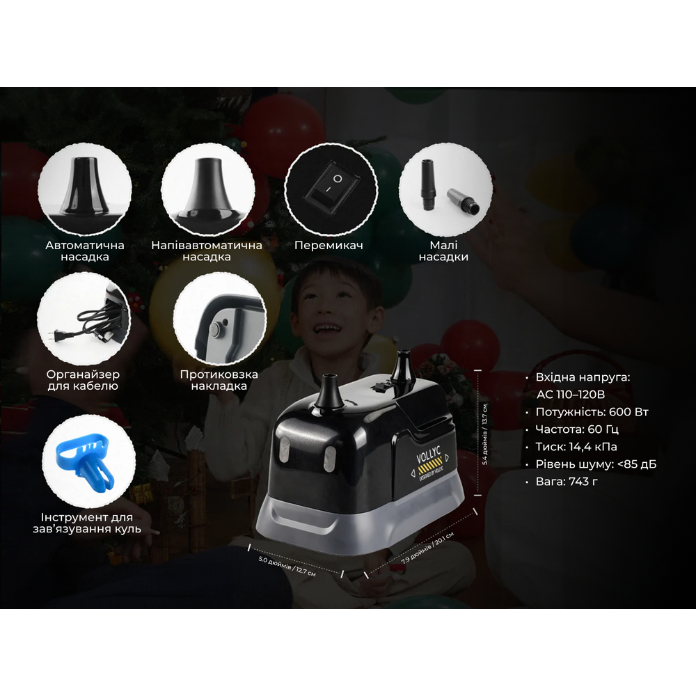 Vollyc Evo — це мережевий компресор для підготовки великої кількості кульок за короткий час. Цей електричний насос працює від розетки та наповнює стандартну кульку повітрям майже миттєво. Він замінює механічні пристрої, тож арки та фотозони збираються швидко і без фізичних зусиль.