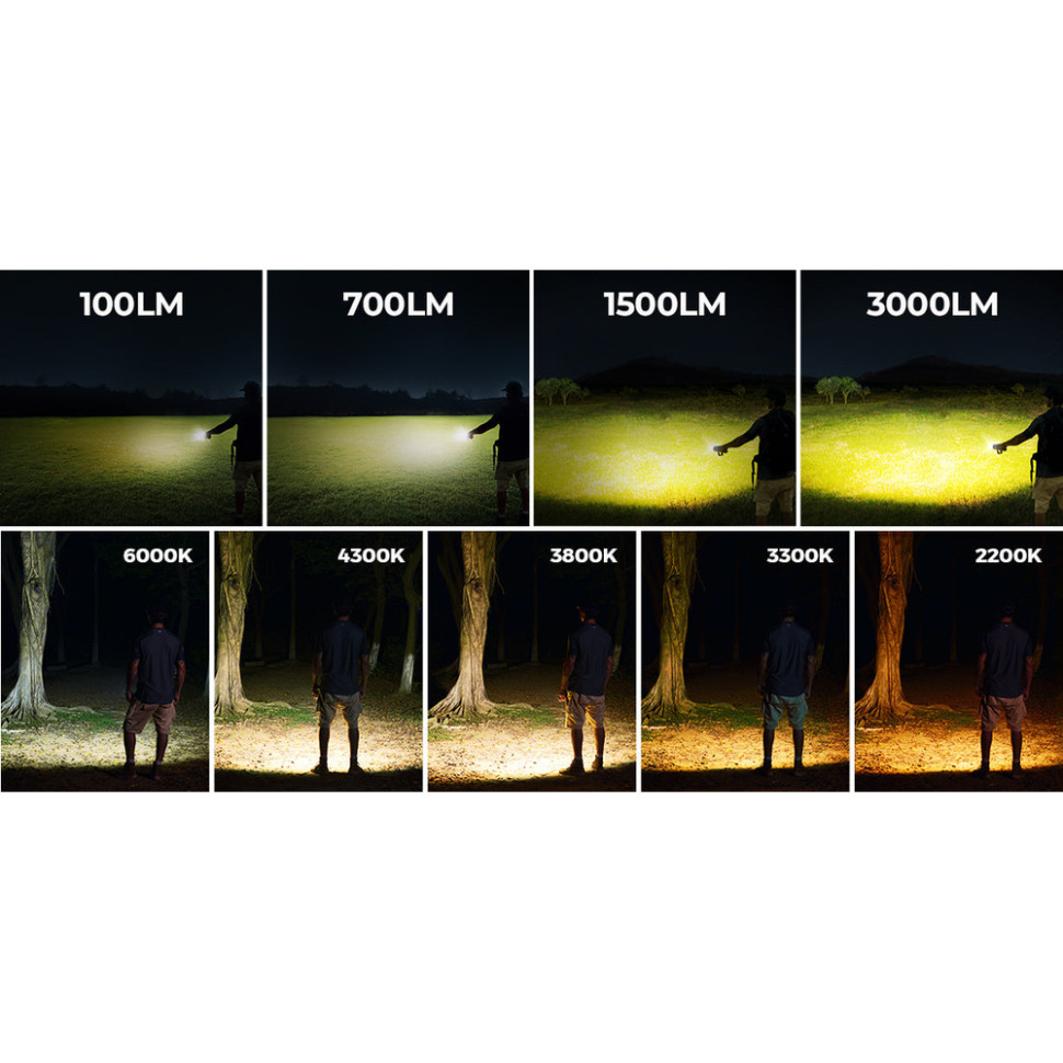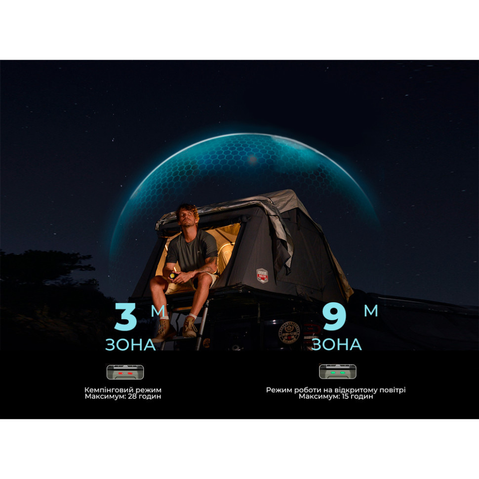 - Адаптивне висвітлення. Інтерфейс складається з 4 рівнів яскравості (100 / 700 / 1500 / 3000 лм) та 5 колірних температур світла (2200K / 3300K / 3800K / 4300K / 6000K). На граничній потужності світло покриває площу 200 м², а час безперервного світіння сягає 100 год за умови використання економного режиму.