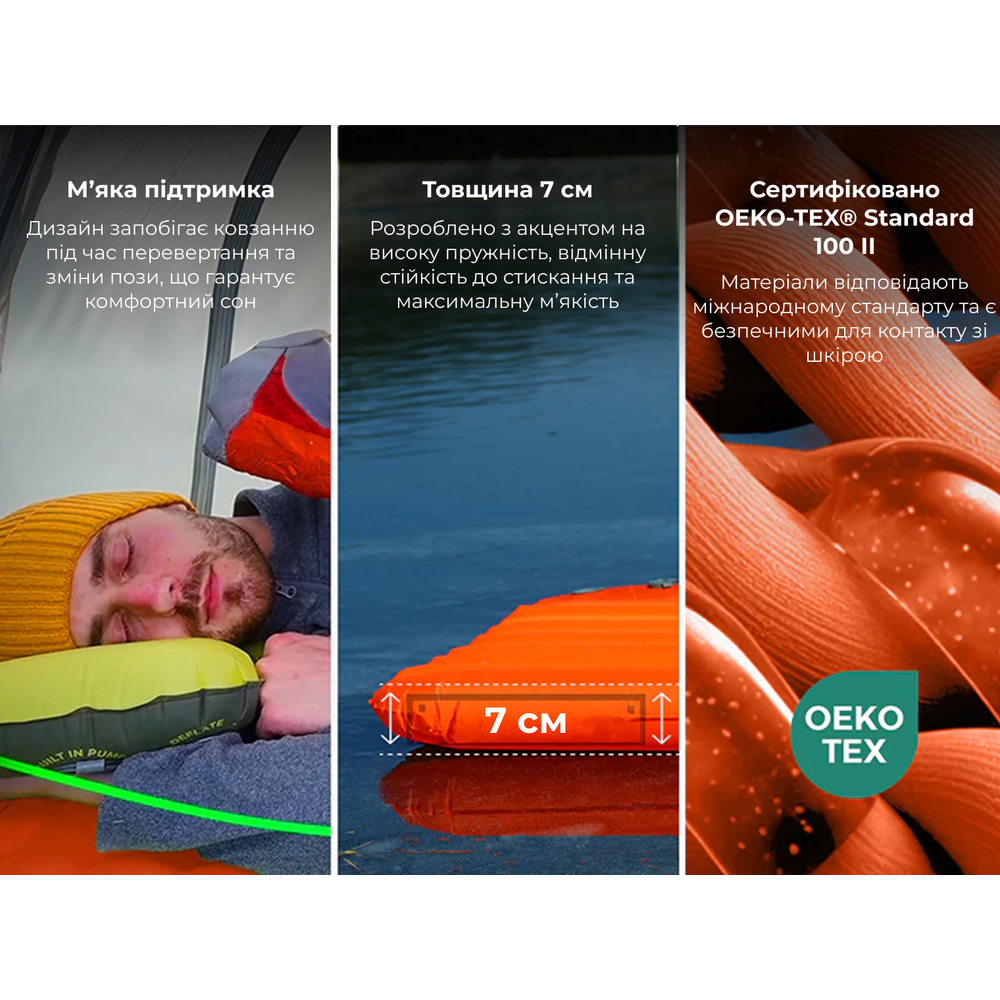 Матрас важить 766 г завдяки поєднанню нейлону 20D та синтетичного утеплювача. При такій легкості виріб має ширину 65 см та товщину 7 см, яка нівелює нерівності рельєфу та забезпечує правильну підтримку хребта.