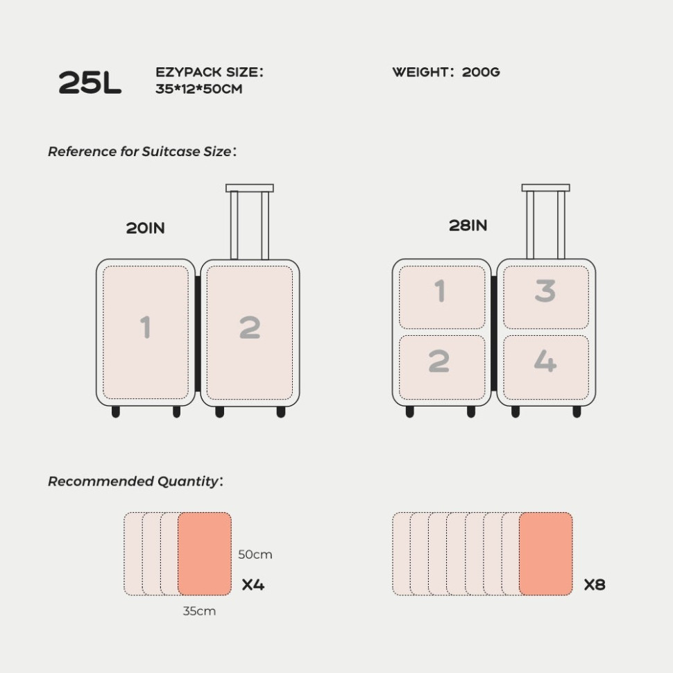 - До 85% компресії. EZY PACK зменшують обʼєм одягу та текстилю до третини вихідного розміру, що залишає до 3 разів більше корисного простору у валізі або рюкзаку.