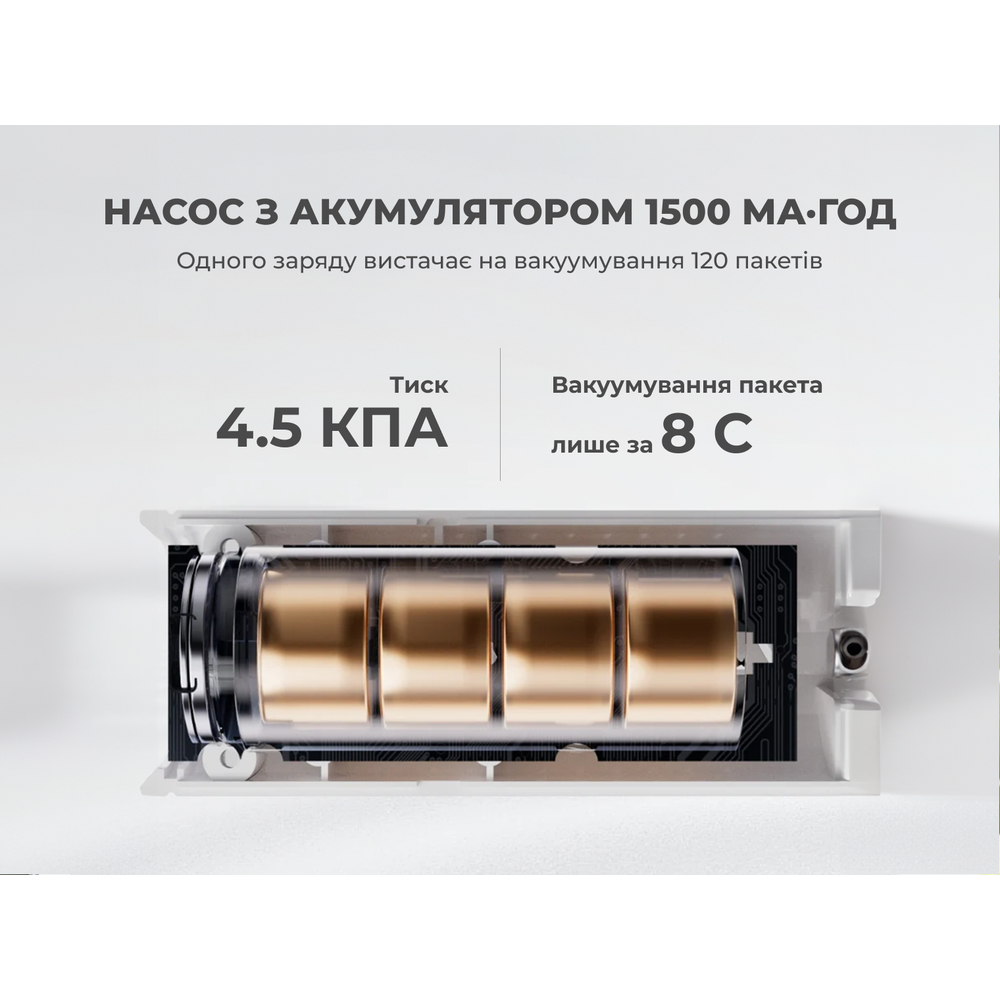 - До 120 пакетів на одному заряді. Ресурсу акумулятора ємністю 1500 мА·год вистачає, щоб зібрати багаж для всієї родини або повністю впорядкувати сезонні речі в шафі без підзарядки. Насос має універсальний порт Type-C, тому його можна зарядити від повербанка, ноутбука або зарядки для смартфона.