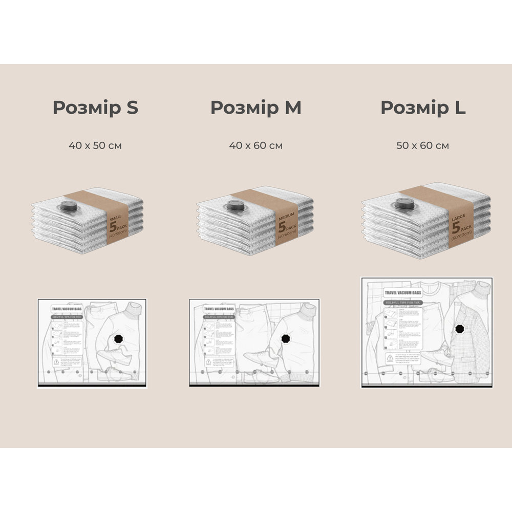- 20 пакетів трьох розмірів у комплекті. Набір містить 8 пакетів Small (40х50 см), 8 пакетів Medium (40х60 см) та 4 пакети Large (50х60 см). Це дає змогу підібрати потрібний розмір як для ручної поклажі, так і для великих валіз.