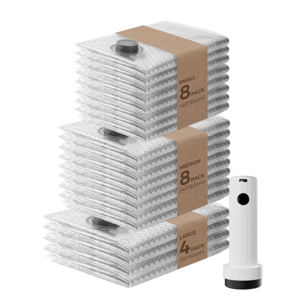 Vollyc NANO BAG SET — це готова система для зменшення об’єму речей, що допомагає звільнити до 85% місця у валізі або шафі. На відміну від ручних методів, цей набір використовує компактний електричний насос, який видаляє повітря за лічені секунди без фізичних зусиль.