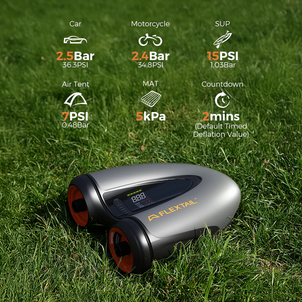 - Двоступенева система (Auto Dual Stage). На першому етапі пристрій працює як турбіна (360 л/хв) для швидкого заповнення об'єму, а на другому — як компресор (90 л/хв) для досягнення високого тиску. Це дає змогу надути стандартну SUP-дошку до 15 PSI всього за 9.5 хвилин.