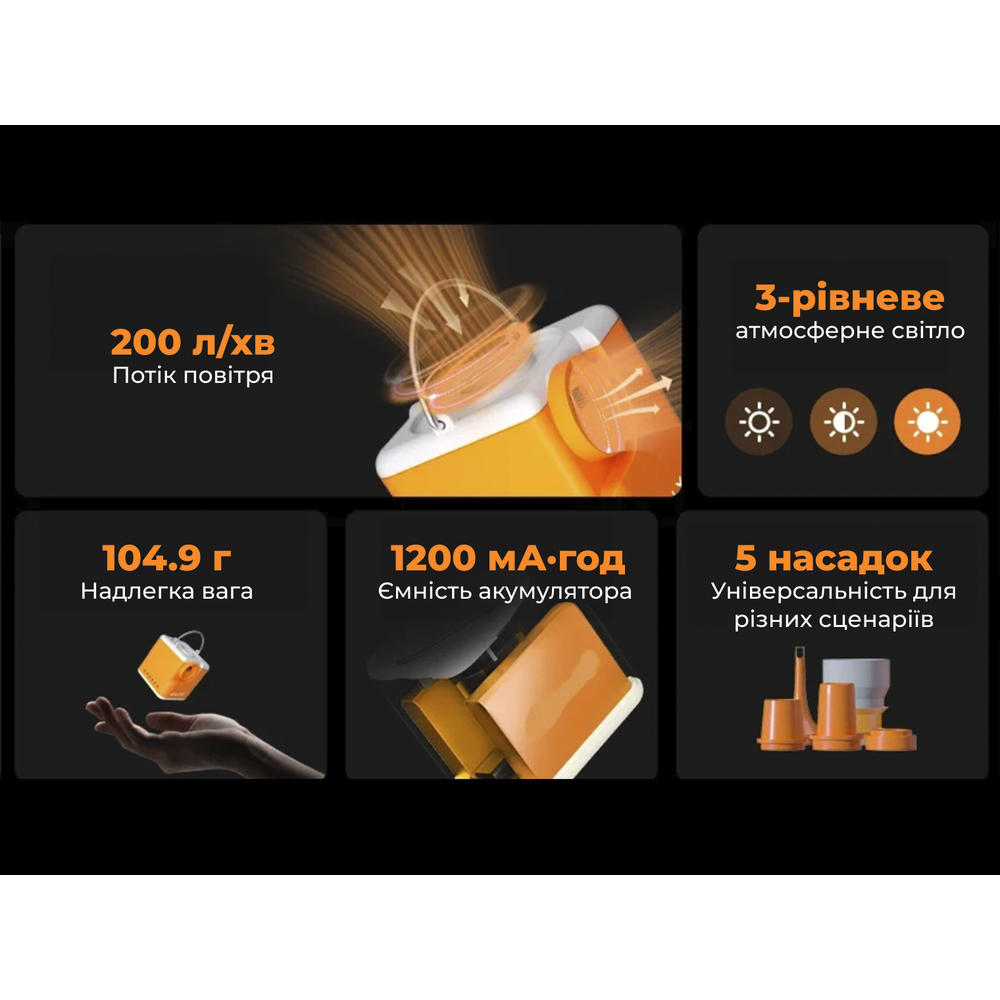 - тип — портативний акумуляторний насос 5 в 1: надування, викачування, вакуум, ліхтар та очищення;