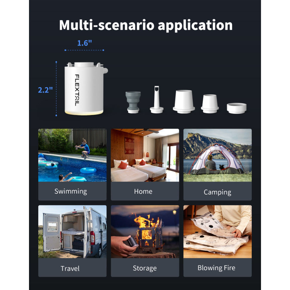 Насос швидко надуває туристичні килимки, подушки, інші надувні вироби та допомагає вакуумувати пакети з речами для економії місця у багажі. За один повний заряд пристрій дозволяє надути до 10–15 туристичних килимків, 12 рятувальних кіл або 1–2 великих матраци.
