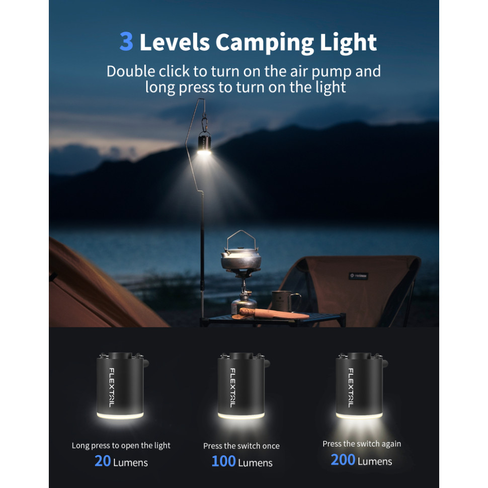 - міні-насос Flextail з функціями 3-в-1 (накачування, здування, кемпінгове світло);