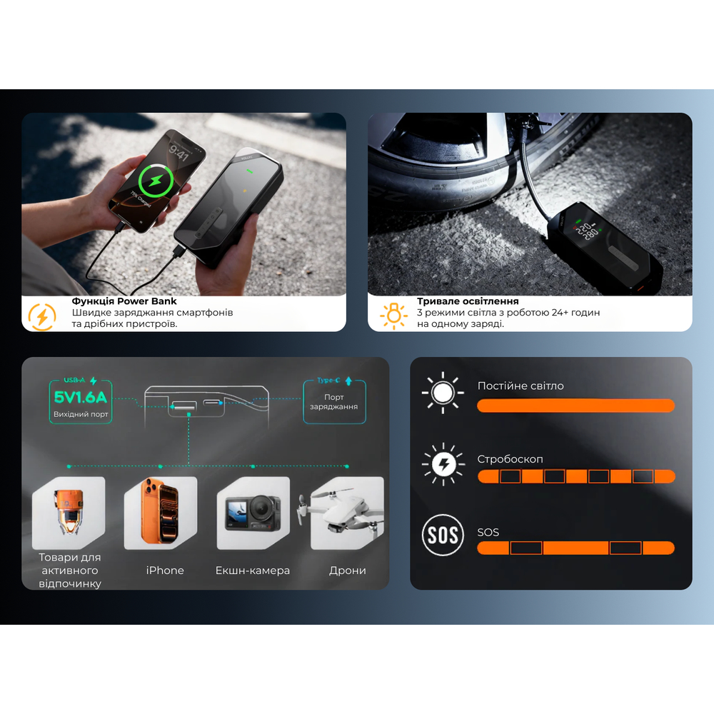 Опис насоса-ліхтаря-powerbank автомобільного Vollyc Evo Tire Pump by Flextail, 150 PSI, 1500 mAh:
