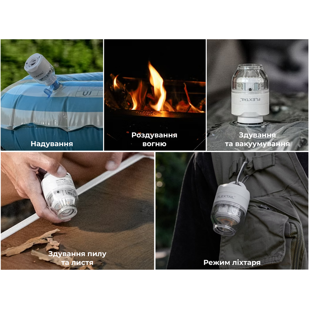 Поток воздуха помогает быстро разжечь огонь в костре или очистить объектив камеры и клавиатуру от пыли.