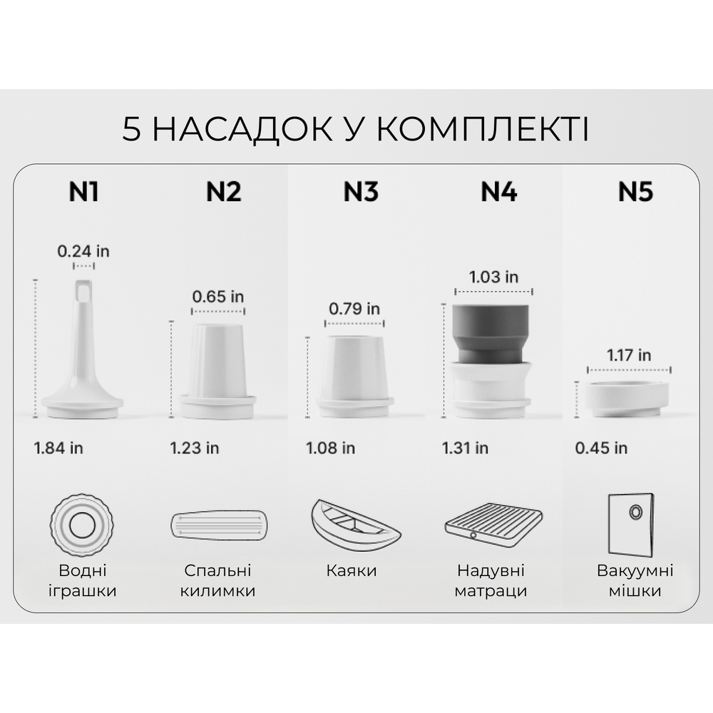 Насос Tiny Pump 3X, набор из 5 универсальных насадок (совместимы с 90% брендов спальных ковриков), кабель для зарядки USB Type-C, инструкция пользователя.