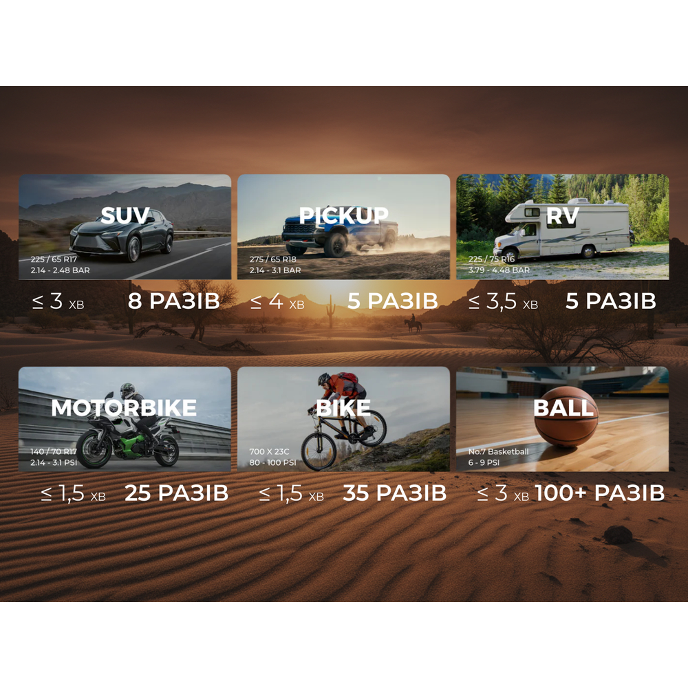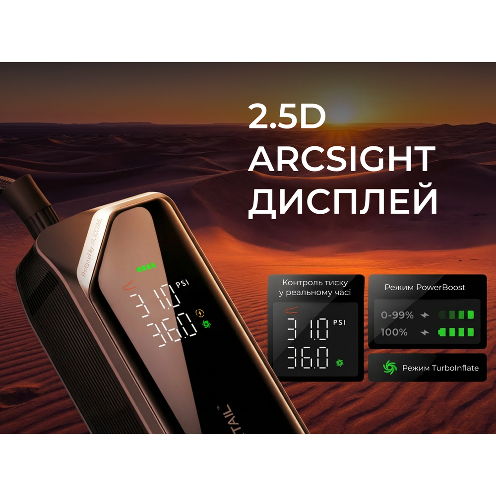 - Интеллектуальный насос. Создает давление до 150 PSI (10.3 BAR). Главной особенностью модели является механическое поворотное кольцо FlexiDial, которое позволяет мгновенно выставлять нужные параметры. Предусмотрено 4 режима (авто, мото, вело, мяч), а функция Auto Shut-off автоматически останавливает компрессор при достижении заданного давления. Показатели отображаются на большом изогнутом дисплее 2.5D ArcSight с защитой от царапин и отпечатков пальцев.