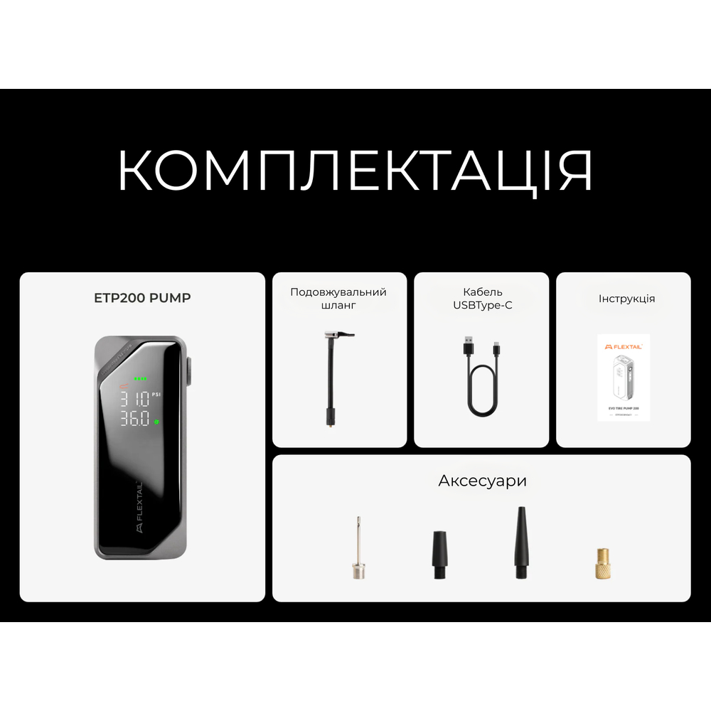 Насос ETP200, удлинительный воздушный шланг, набор универсальных насадок-переходников, кабель USB Type-C, инструкция пользователя.