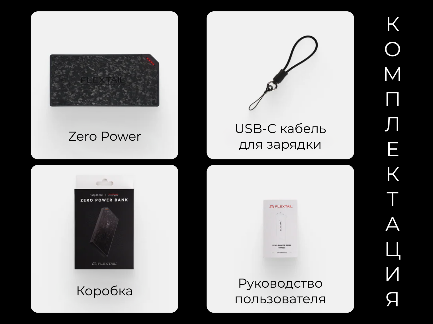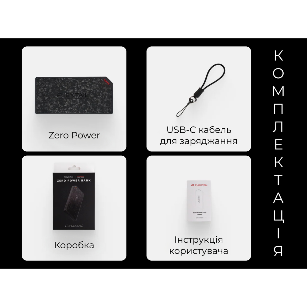 Внешний аккумулятор Zero Power, кабель-шнурок USB-C, инструкция пользователя, упаковочная коробка.