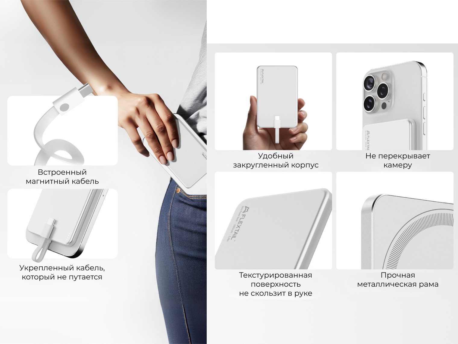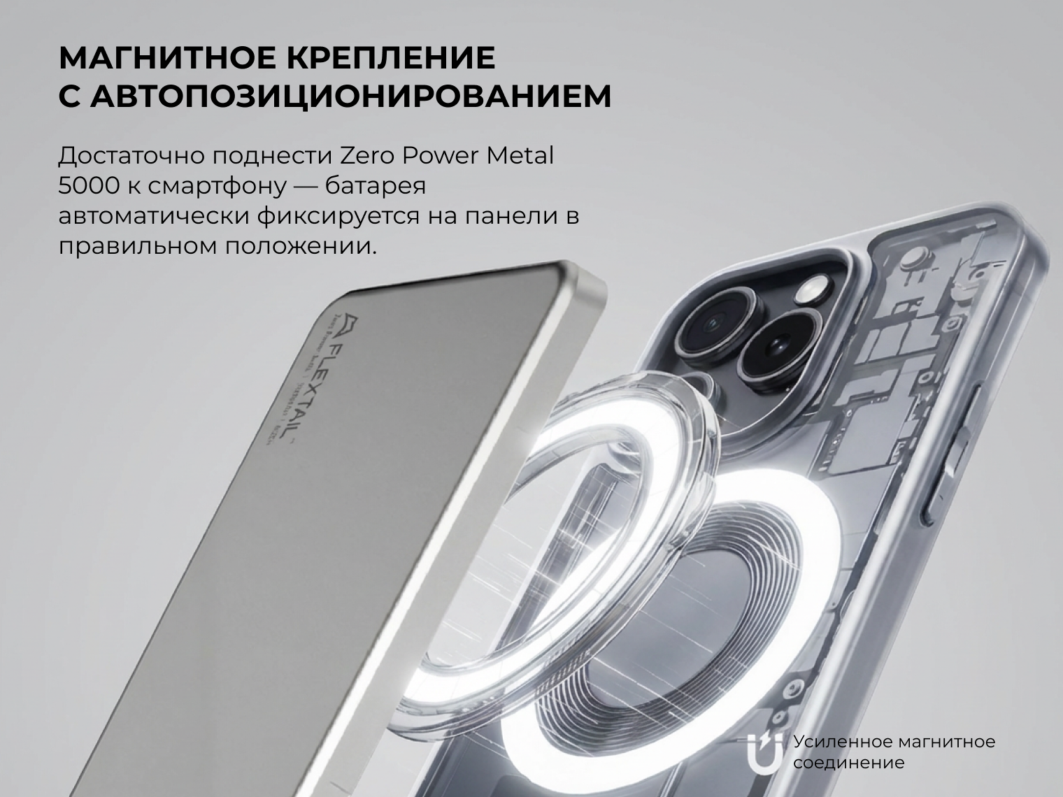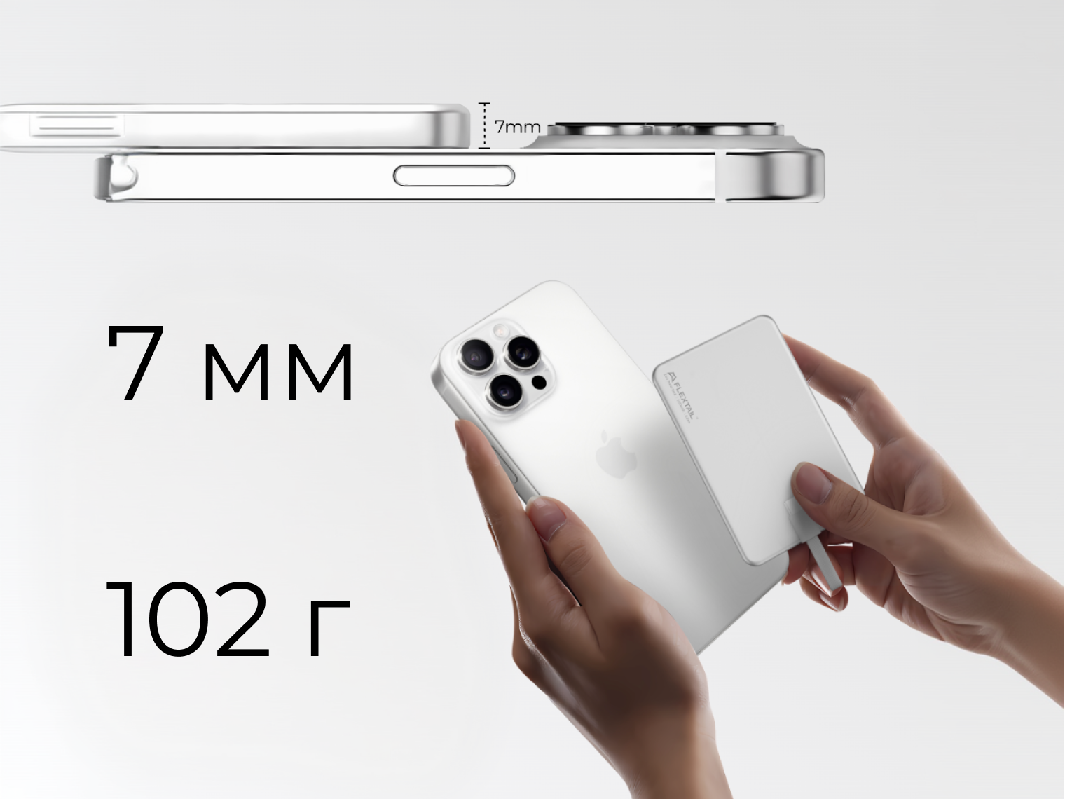Главная особенность модели — мощные неодимовые магниты. Когда вы подносите повербанк к смартфону, он автоматически притягивается и встает ровно по центру задней панели. Сила магнитов позволяет аккумулятору оставаться на месте, даже если вы активно пользуетесь телефоном, достаете его из кармана или держите одной рукой — устройство не сдвигается и не выпадает.