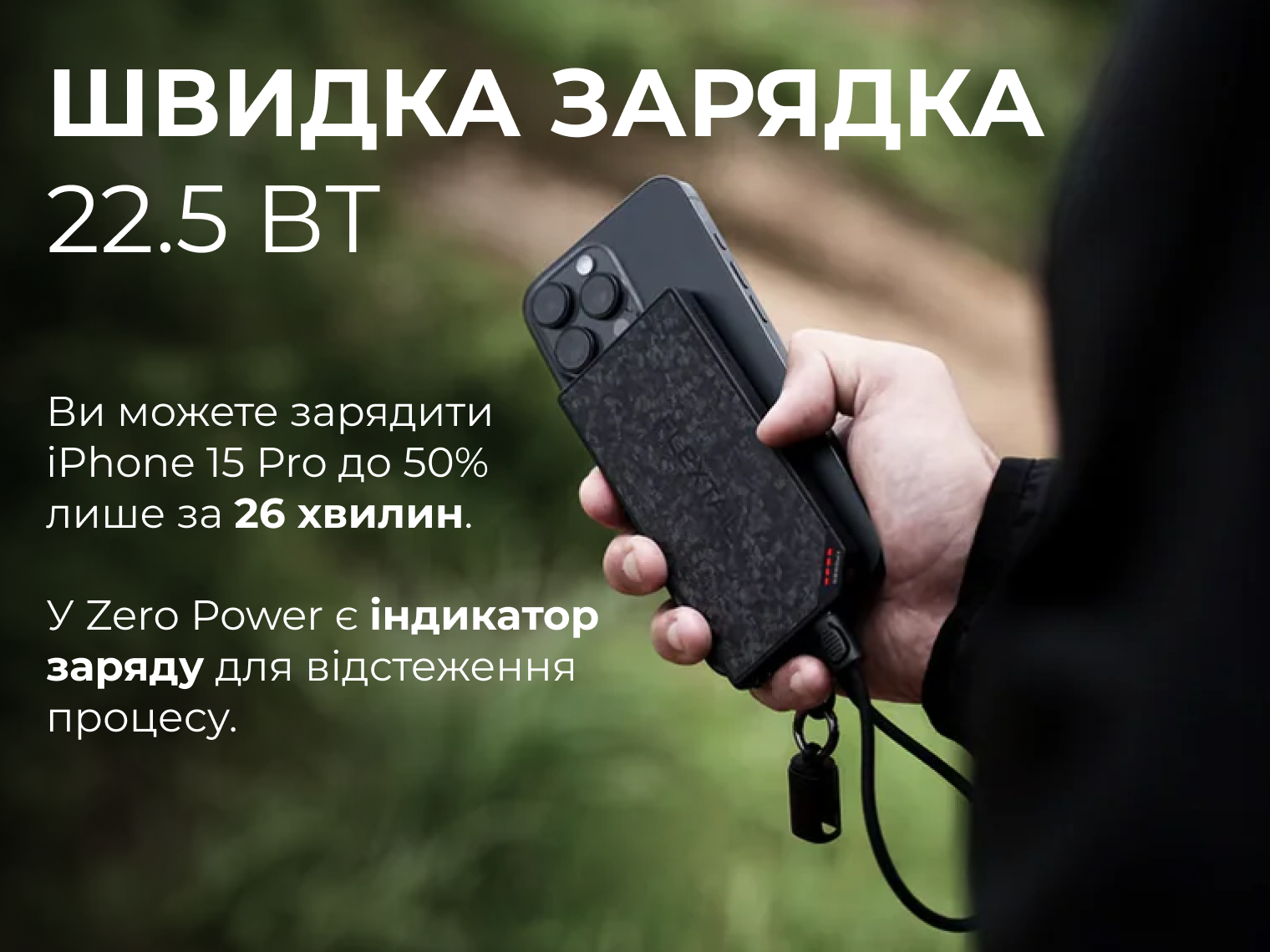 Міцний USB-C кабель виконує роль ремінця. З ним акумулятор надійно фіксується на руці або сумці та завжди залишається під рукою.