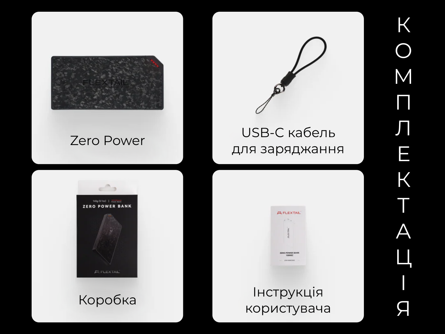 Зовнішній акумулятор Zero Power, кабель-шнурок USB-C, інструкція користувача, пакувальна коробка.